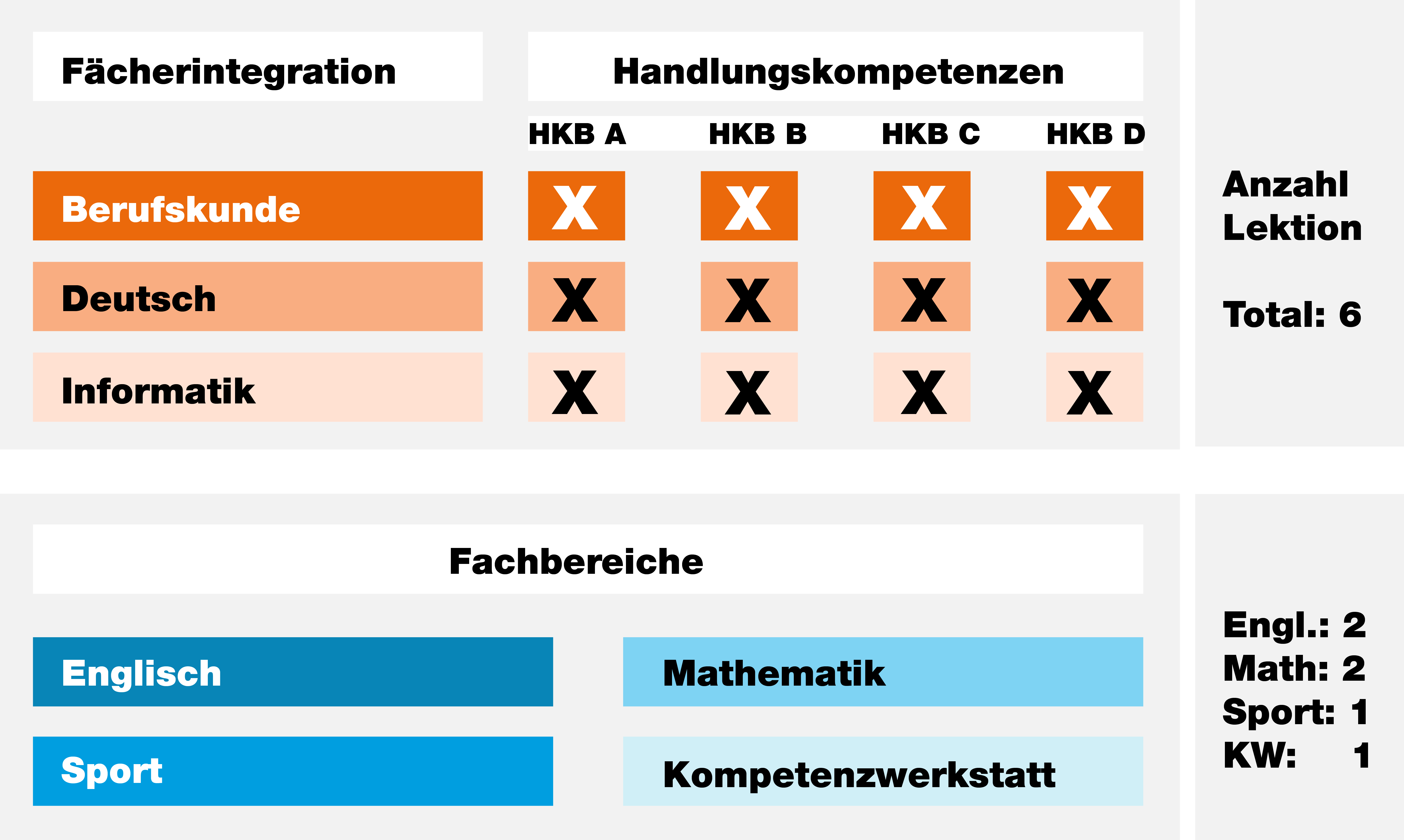 • Deutsch (2 Lektionen) wird bei den Handlungskompetenzen HKB A bis HKB D ebenfalls integriert.