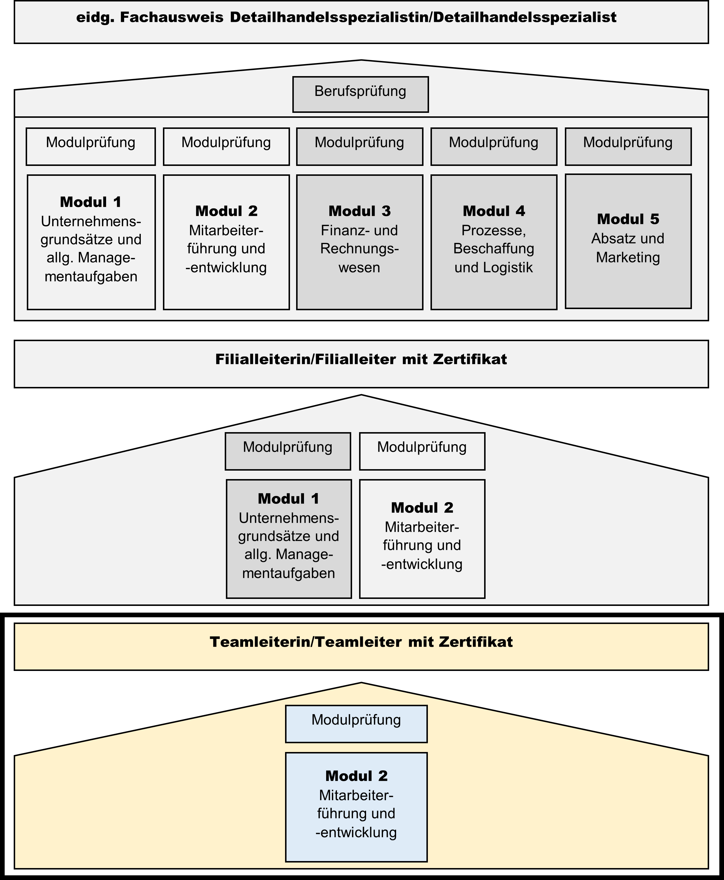 Sie haben die Möglichkeit die Lehrgänge Filialleiter/-in und Detailhandelsspezialist/-in im Anschluss verkürzt zu absolvieren.